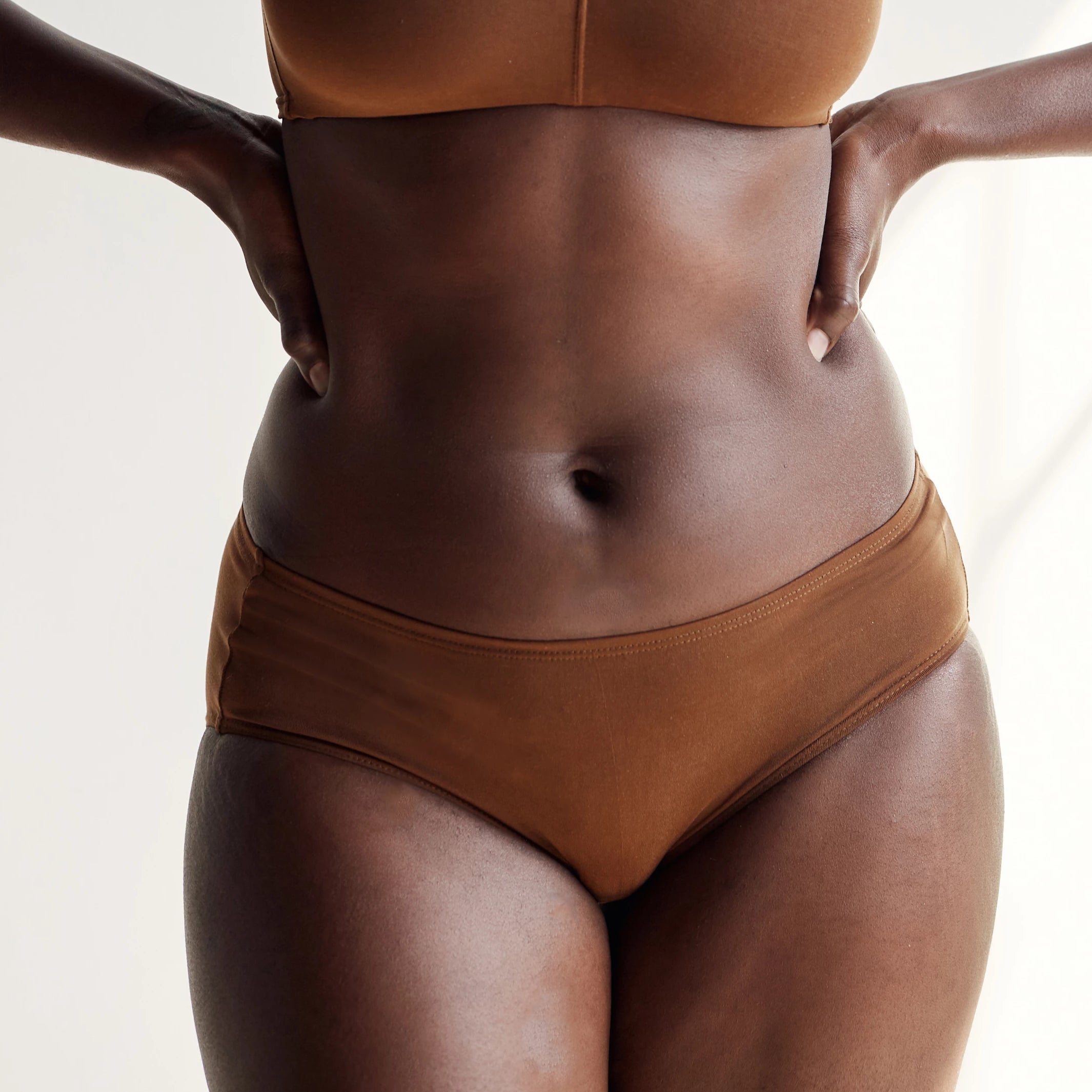 PROCLAIM tencel Mid-rise brief in Maya nude, a caramel tone.